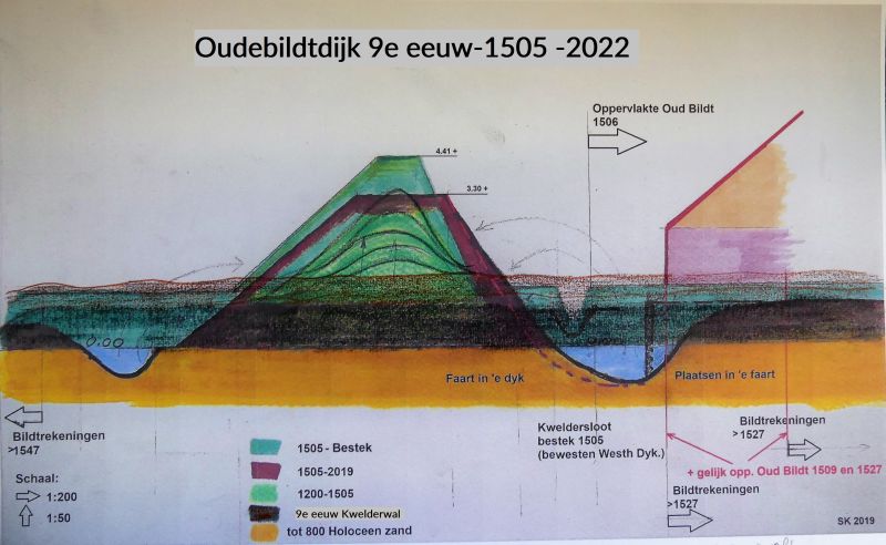 De helft van het profiel van de ontworpen Oudebildtdijk lag er in 1505  al in de vorm van een steeds verhoogde zomerdijk op een brede kwelderwal. Deze werd tussen 1505 en 1508 nog één keer opgehoogd. Tien boerderijen van vóór 1505 In afb. 2 geef ik aan wat er vanaf de negende eeuw  met de Oudebildtdijk is gebeurd. De brede kwelderwal-zwart als basis, de verhoogde zomerdijk van vóór 1505, de verhoogde dijk van 1505 -groen en de situatie direct na de verkaveling in 1509. Met het huidige dwarsprofiel kun je terug redeneren hoe de Oudebildtdijk en de vaarten aan weerskanten er toen bij lagen. Uiteraard is de dijk in die meer dan 500 jaar stevig ingeklonken (van 4.41+ naar 3.30 + NAP-bruin) Aan weerskanten zijn vaarten gegraven, die duidelijk zichtbaar zijn op de kaart van Jan Jansz Coster uit 1571. Met de klei uit de gegraven vaarten werd de dijk opgehoogd. De vaart aan de Noordkant is vóór 1547 gegraven, want daarna zijn de oppervlakten van de kavels op het Nij Bildt steeds gemeten en ongewijzigd. De geplande kwelsloot ten Zuiden van de Oudebildtdijk is vervangen door de veel bredere en diepere vaart die ver zuidwaarts uitdijt.  Zover zelfs, dat daardoor een aantal boerderijen in het water zouden komen te staan. Daar werd de vaart in elk geval vóór 1527 gegraven, want langs de vaart hebben vanaf dat jaar de kavels altijd dezelfde oppervlakte gehouden.  De oppervlakte van de kavels langs de zuidzijde van de Oudebildtdijk veranderde niet. De totale oppervlakte van het Oud-Bildt veranderde niet tussen 1509 en 1527. De vaart werd al in 1509 op z’n breedst en moest om de al aanwezige boerderijen worden gelegd. De aanwezige boerderijen dateren dus van vóór 1505, want daarna werd de vaart aan de zuidzijde breder. Ik heb minstens tien boerderijen gevonden die daar vóór 1505 hebben gestaan. De Oudebildtdijk was al stevig ingeklonken en de al aanwezige sloot kon breder en dieper worden uitgegraven zonder verlies aan stabiliteit van de Oudebildtdijk.