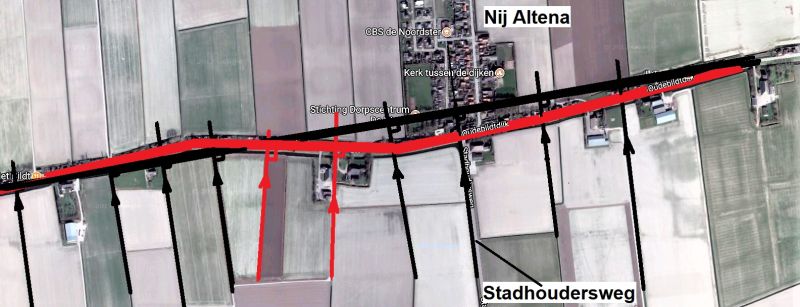 Dit is heel goed te illustreren met de twee dijkomleggingen bij de Kouweweg en Nij Altoenae. Op de afbeeldingen 2 en 3 heb ik de sporen van de twee dijkdoorbraken op deze plekken en de achterbleven wielen kunnen “blootleggen”. Op afb. 3 zie je een detail van de dam(zwarte lijn) in de Monnickendijck, die daar rond 1200 en 1260 in de brede bedding van de Burdine toen, tussen Nij Altoenae en de Kadal is aangelegd. Deze Burdine liep via Marsum, de Prúlhoek, diagonaal langs Nij Altoenae, richting Zwarte Haan. De dam in de geul bleef een zwakke plek voor de vaak felle overstromingen, gezien de littekens van de dijkdoorbraken, wielen, omgeleide dijken, bodemstructuur en de verstoorde perceelstructuur, bij de Kouweweg en Nij Altoenae.