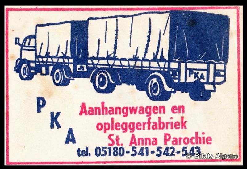 PKA staat voor 'Piet Kampen Aanhangwagen'. Pieter Kampen begon zijn landbouwmachinefabriek op 1 januari 1946 door de overname van een kleine smederij. De fabriek ging in 1951 failliet. In de advertentie van het daaropvolgende boelgoed werden twee auto's genoemd: een 1-tons gesloten bestelauto "Chevrolet" en een 4-persoons luxe auto "Ford Prefect". Op naam van Pieter Kampen uit St. Annaparochie stonden de kentekennummers B-32002 , B-34496 en B-40901.