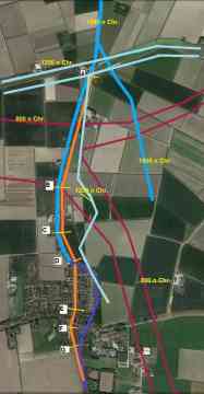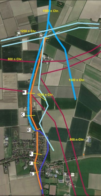 Aan de hand van een aantal kaartreconstructies van 800 (paars),1250 (lichtblauw) en 1500 n Chr. (blauw). heb ik de geschiedenis van deze belangrijke waterweg kunnen achterhalen.